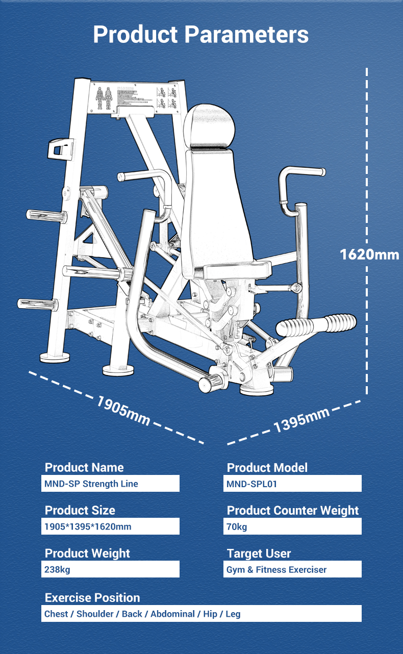 MND Fitness combina la investigación biomecánica con la fabricación de nivel industrial para ofrecer máquinas de prensa de pecho que resisten el uso diario riguroso. Nuestra serie SPL está diseñada para brindar rendimiento, seguridad y satisfacción del usuario.