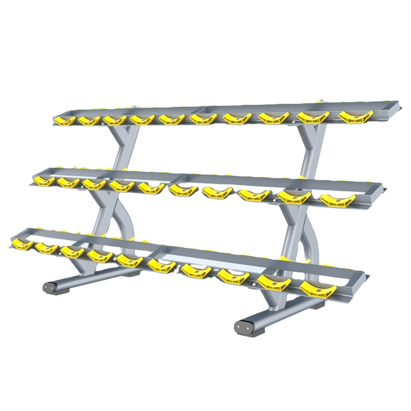 Almacenamiento seguro y accesible: cada nivel presenta el mismo diseño confiable de bandeja en forma de media luna , lo que garantiza que cada mancuerna se sujete de forma segura. El espaciado cuidadoso mantiene un fácil acceso a las pesas en los tres niveles.