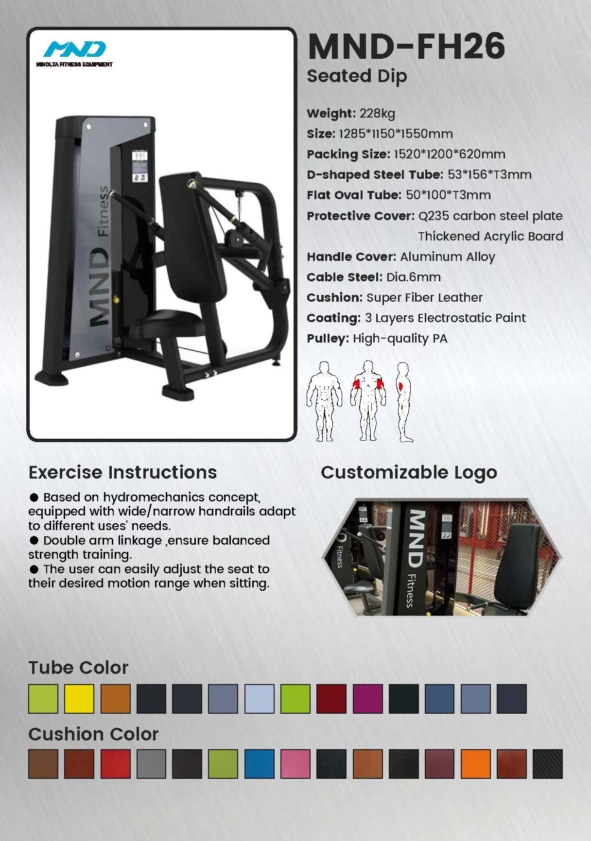 La máquina de fondos sentado FH26 transforma un ejercicio clásico de peso corporal en un movimiento de fuerza progresivo y mensurable. Al proporcionar soporte completo para el torso y una trayectoria guiada, permite una sobrecarga específica de los tríceps, lo que permite a los usuarios ir más allá de sus limitaciones de peso corporal de forma segura.